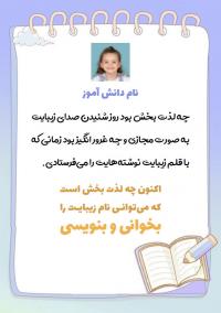 پسر عزیزم. خیلی دوست دارم برای من با خط خودت هرچه که دوست داری بنویسی. هرچه که بنویسی را من دوست دارم چون نتیجه ی تلاش چند ماه مدرسه رفتن و زحمت کشیدن توست.