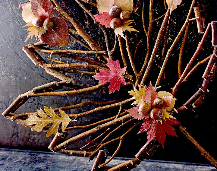 شاخههای اضافی درختان یا آنهایی را که در حیاط روی زمین افتادهاند، بردارید و یک کاردستی زیبای پاییزی درست کنید، مثل آنچه در تصویر میبینید. شاخهها را به هم بچسبانید و شکل یک برگ پاییزی را با آنها درست کنید.