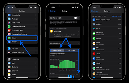 برای بررسی جزئیات میزان مصرف باتری خود، به Settings > Battery بروید . پیش فرض «Last 24 Hours» است و نشان می دهد کدام برنامه ها بیشترین انرژی را مصرف می کنند (از جمله Home & Lock Screen و Siri).