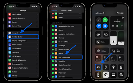 می توانید حالت کم مصرف را در Settings > Battery روشن کنید. با این حال، دسترسی سریع به حالت کم مصرف در مرکز کنترل مفید است. به Settings > Control Center > Customize Controls بروید، سپس اگر نماد + در کنار حالت Low Power Mode وجود ندارد، ضربه بزنید.