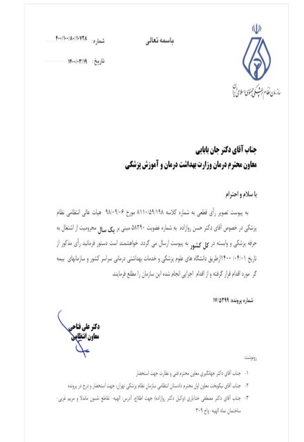 به گزارش ایسنا ؛ در متن نامه دکتر فتاحی معاون انتظامی سازمان نظام پزشکی خطاب به دکتر قاسم جان بابایی - معاون درمان وزارت بهداشت مبنی بر محکومیت «حسین روازاده» آمده است:« به پیوست تصویر رأی قطعی به شماره کلاسه ۱۹۸/۵۹/۸۱۱۰ مورخ ۹۸.۰۹.۰۶ هیات عالی انتظامی نظام پزشکی در خصوص آقای دکتر حسن روازاده به شماره عضویت ۵۸۲۹۰ مبنی بر یک سال محرومیت از اشتغال به حرفه پزشکی و وابسته در کل کشور به پیوست ارسال می گردد. خواهشمند است دستور فرمائید رأی مذکور از تاریخ ۰۱/۰۴/ ۱۴۰۰ازطریق دانشگاه های علوم پزشکی و خدمات بهداشتی درمانی سراسر کشور و سازمانهای بیمه گر مورد اقدام قرار گرفته و از اقدام اجرایی انجام شده این سازمان را مطلع فرمایند. »